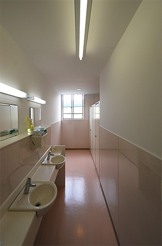 会社トイレの壁タイルが劣化し、改修が必要になりました。 収納スペースも無く、とても窮屈な場所でしたが、お客様が出入りすることも考慮し、落ち着いた色を取り入れました。 また「いつも綺麗に保っていけるように」をコンセプトに工夫をこらしています。