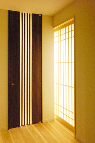 ●施主様のこだわりの内装 玄関ホール、リビングダイニングは落ち着きのあるシックな印象に、水まわりや子供部屋などは明るく清潔感のある印象に仕上げました。 リビングダイニングは暖かみのある照明で堅くなりすぎず、柔らかい空間になっています。 町並みの景観を守る効果も込めた1階部分の格子が、周囲の家と調和しています。 |